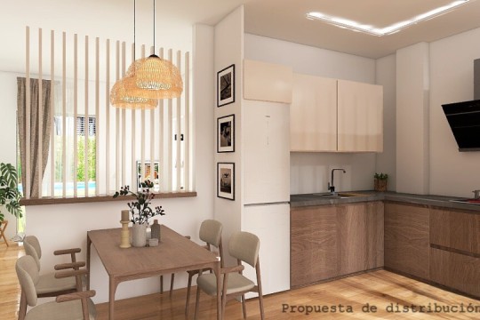 Cocina amueblada y equipada con electrodomésticos. Solados en Gres Cerámico. Carpintería exterior en Aluminio termo lacado en Blanco. Carpintería interior en Madera de Pino. Dispone de Aire Acondicionado Central con Bomba de Calor. Puerta de Seguridad.